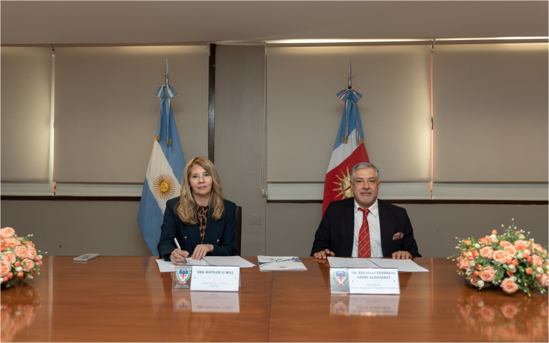 En el Salón Auditorio de Casa de Gobierno firmaron el convenio la Ministra de Justicia y DDHH de la Provincia, Dra. Matilde O’Mill; el Fiscal General de la Provincia, Dr. Luis Alberto de la Rúa y el Defensor General de la Provincia, Dr. Enrique Billaud; luego se realizó la firma en Tribunales con el Presidente del Superior Tribunal de Justicia, Dr. Eduardo Federico López Alzogaray.